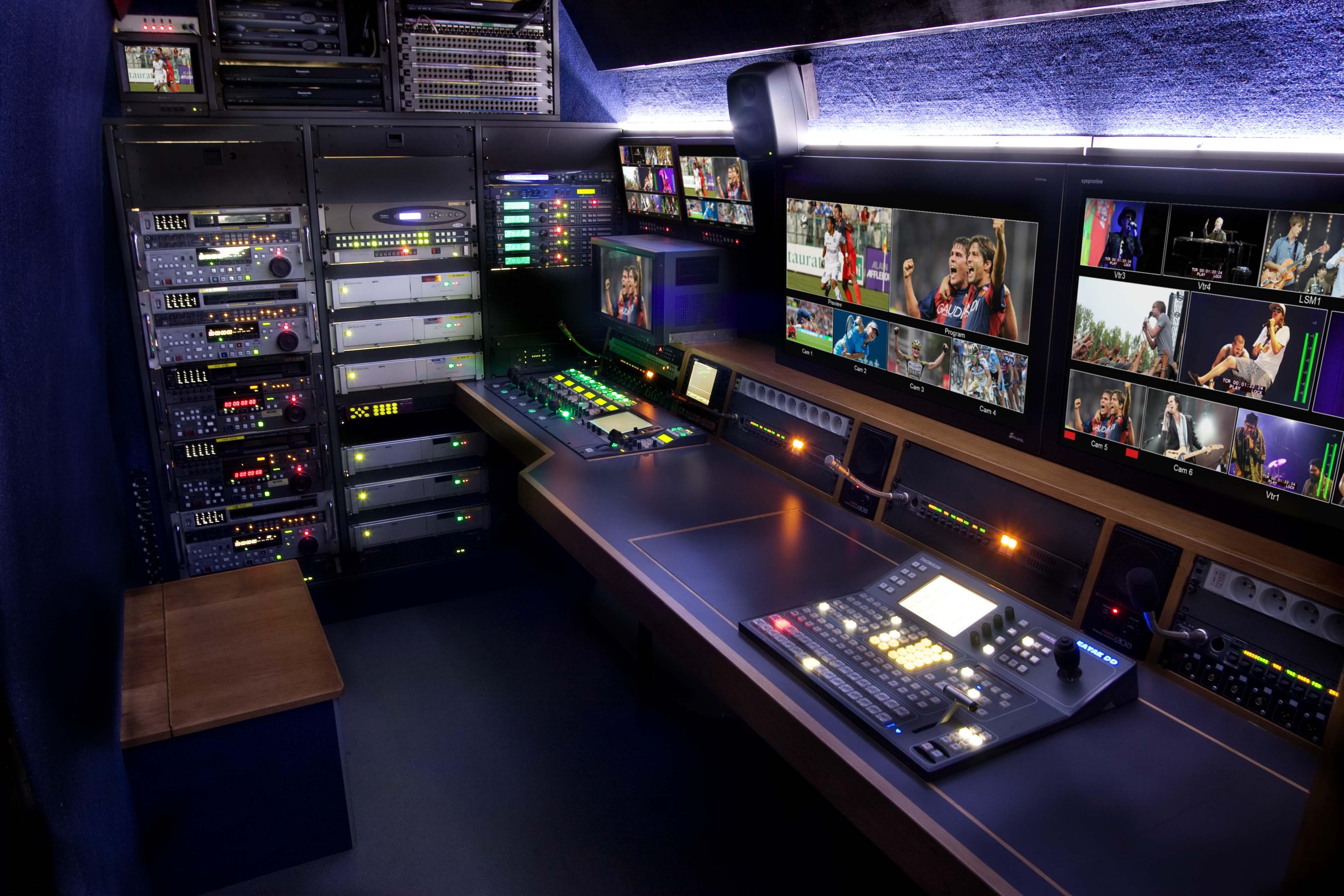 High-end technology in a compact layout, makes this OB in high demand for small productions with big needs. From talk shows, to small concerts or sports events, this unit is an efficient solution and can handle up to 6 cameras.